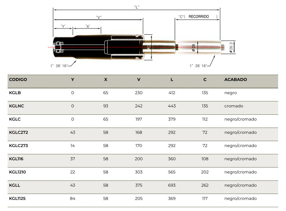 - Pistón de acero pintado en negro. Altura mínima: 55 cm / Altura máxima: 80 cm