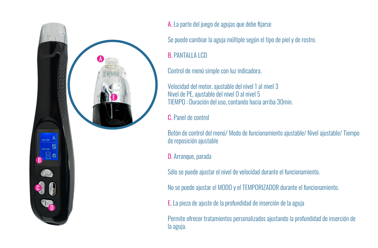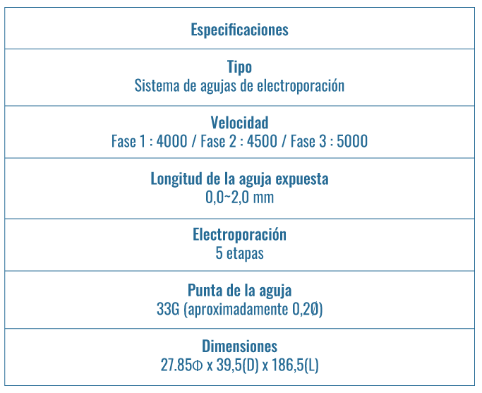 Dispositivo profesional de microneedling que combina los beneficios de la punción dérmica con la avanzada tecnología de la electroporación.