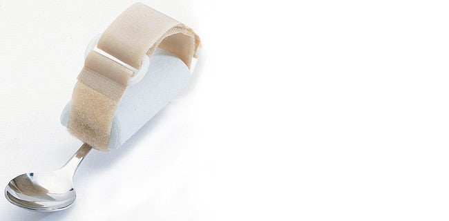 Ajustable al tamaño de la mano de un adulto. Sujeta cubiertos, cepillos de dientes y pequeños utensilios.