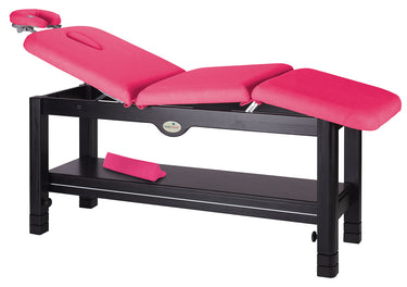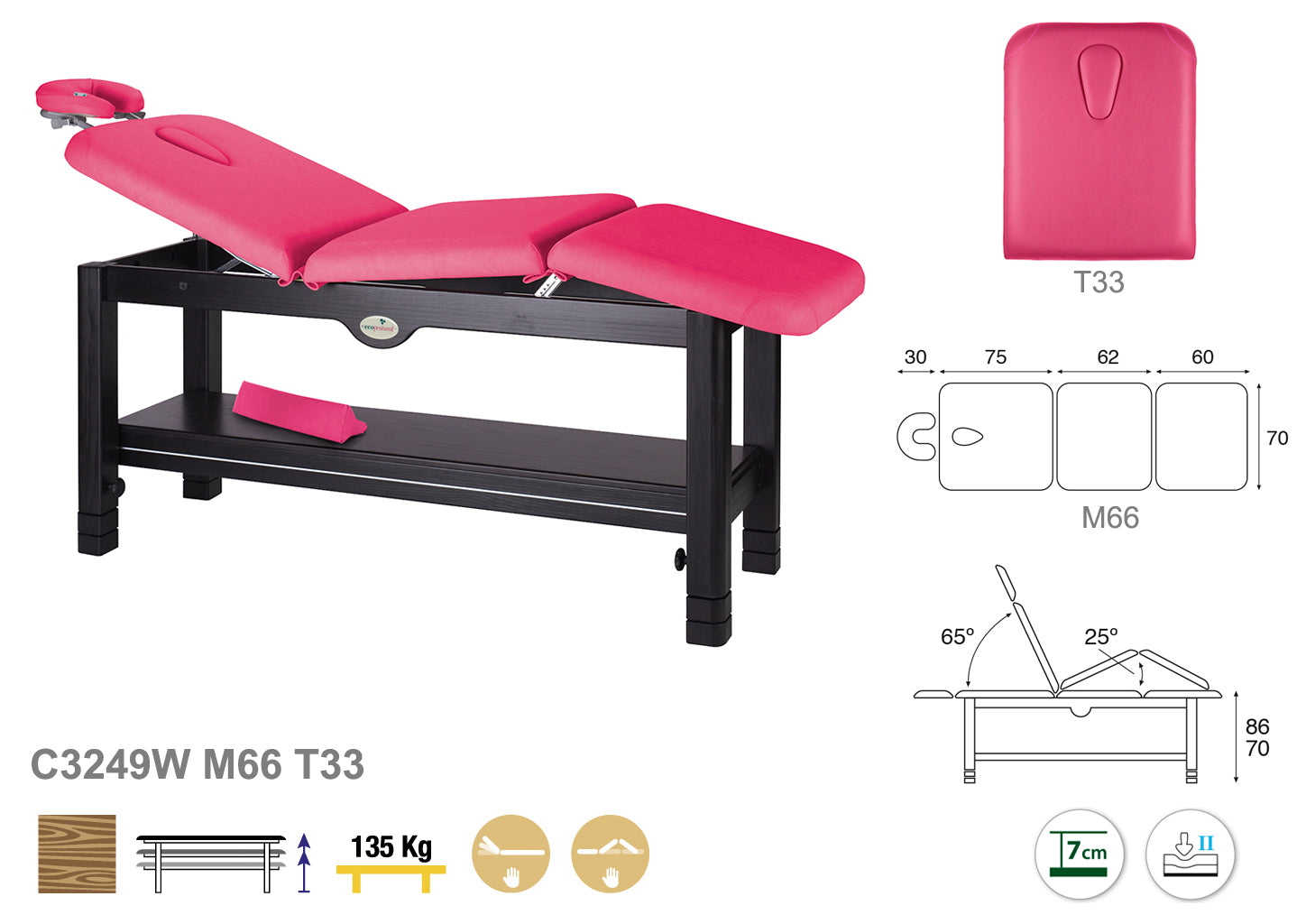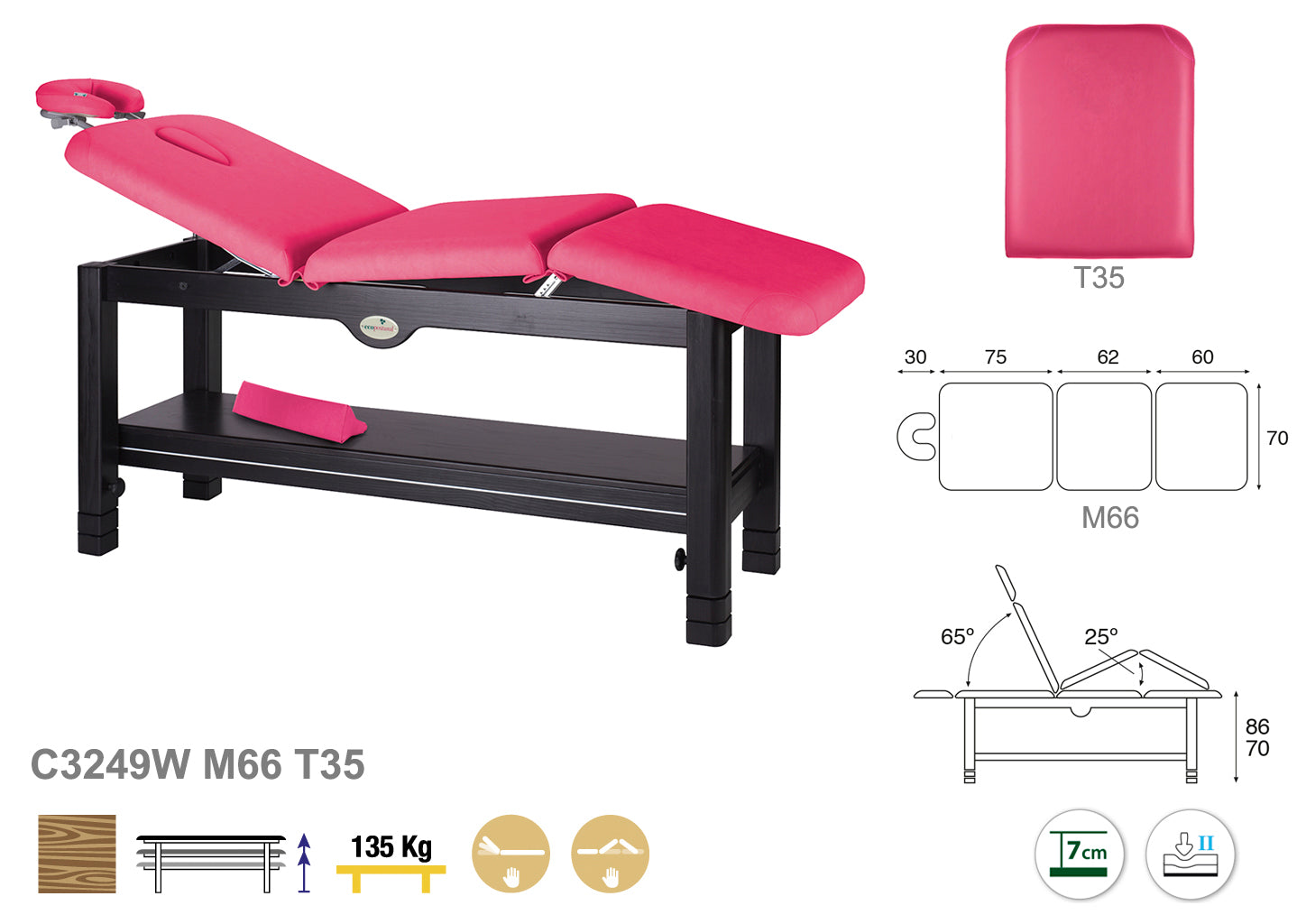 Su madera en acabado wengué aporta durabilidad y una estética elegante, mientras que sus tres cuerpos ajustables permiten adaptarse a diferentes posiciones y necesidades del paciente. Ideal para profesionales que buscan una camilla confiable, esta pieza combina funcionalidad y confort para facilitar tratamientos eficaces y seguros.
