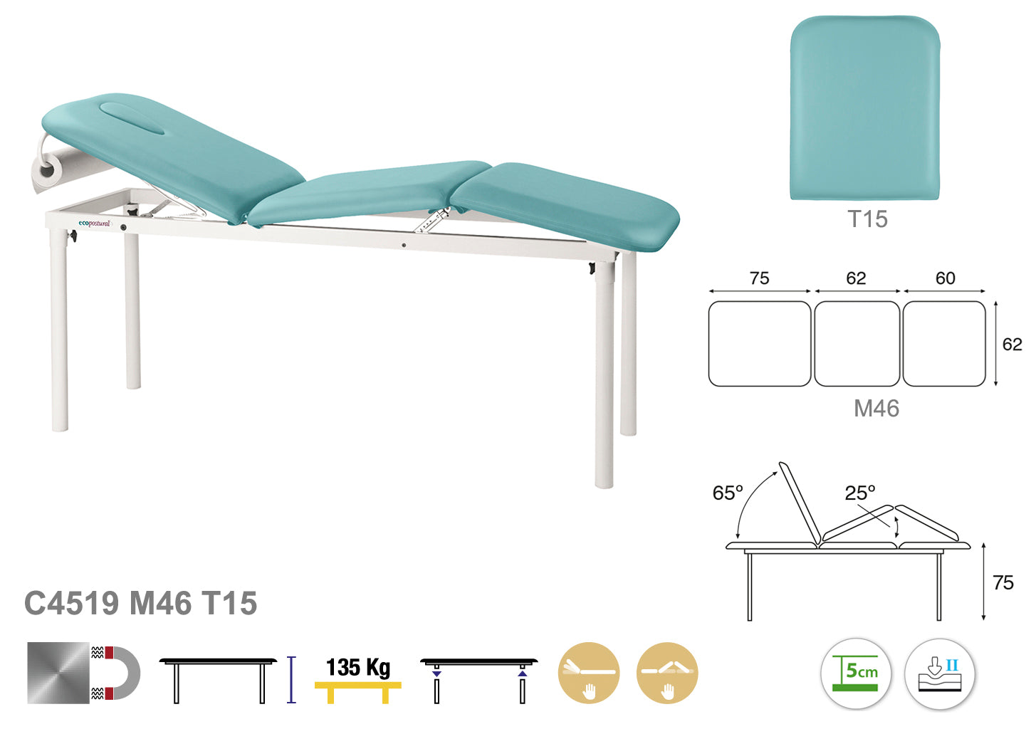 Dividida en tres cuerpos ajustables, permite una mejor adaptación a diferentes posiciones y necesidades terapéuticas, facilitando el trabajo del profesional y mejorando la experiencia del paciente. Gracias a su diseño ergonómico, proporciona un soporte óptimo y una postura adecuada, promoviendo un ambiente seguro y confortable en cada sesión.