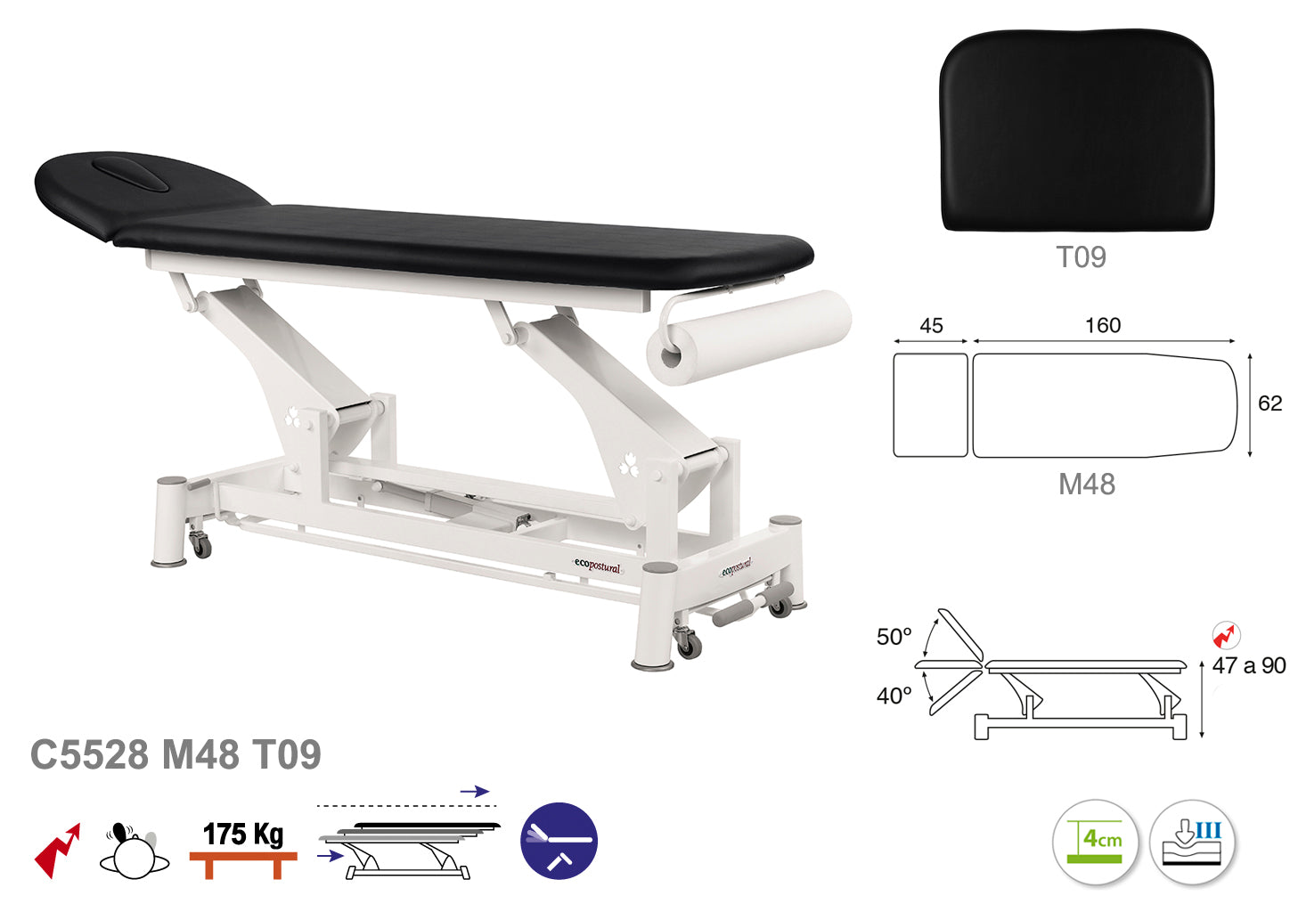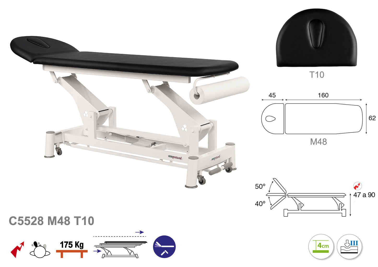 La Camilla Eléctrica Ecopostural Biela Blanca Técnica, modelo C5528, con unas dimensiones de 62x207 cm, está diseñada para ofrecer un soporte ergonómico óptimo durante tratamientos y terapias.