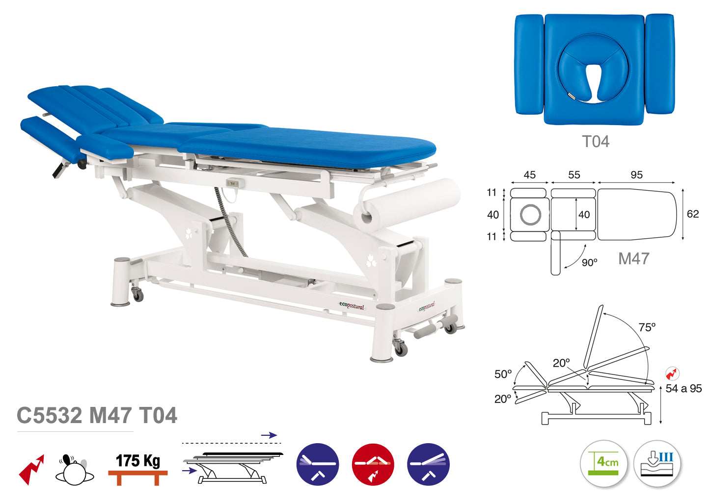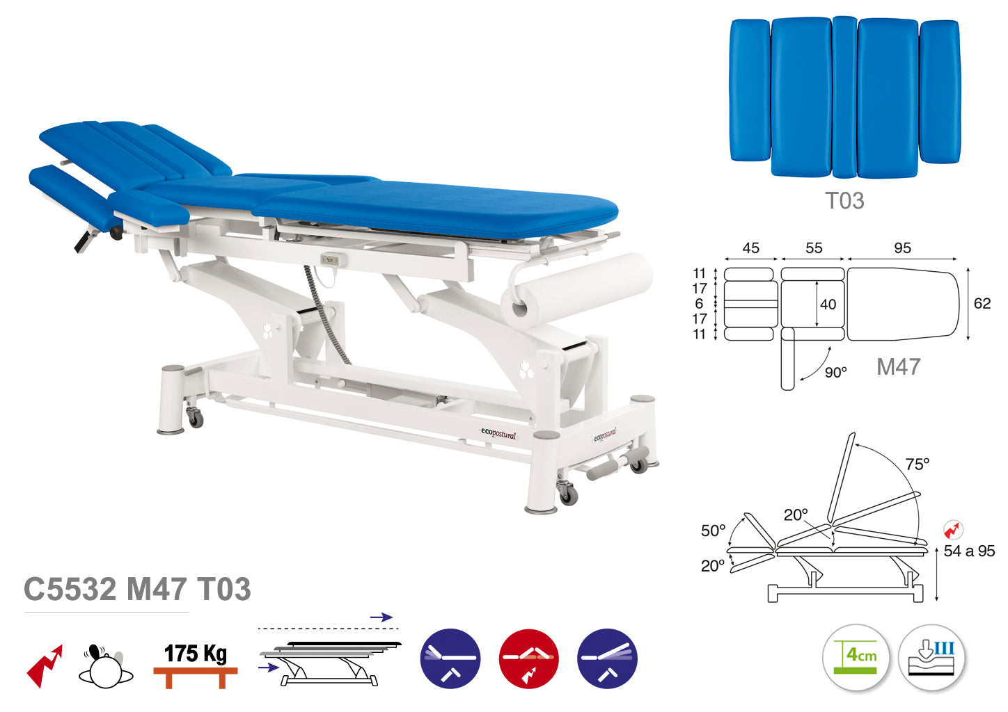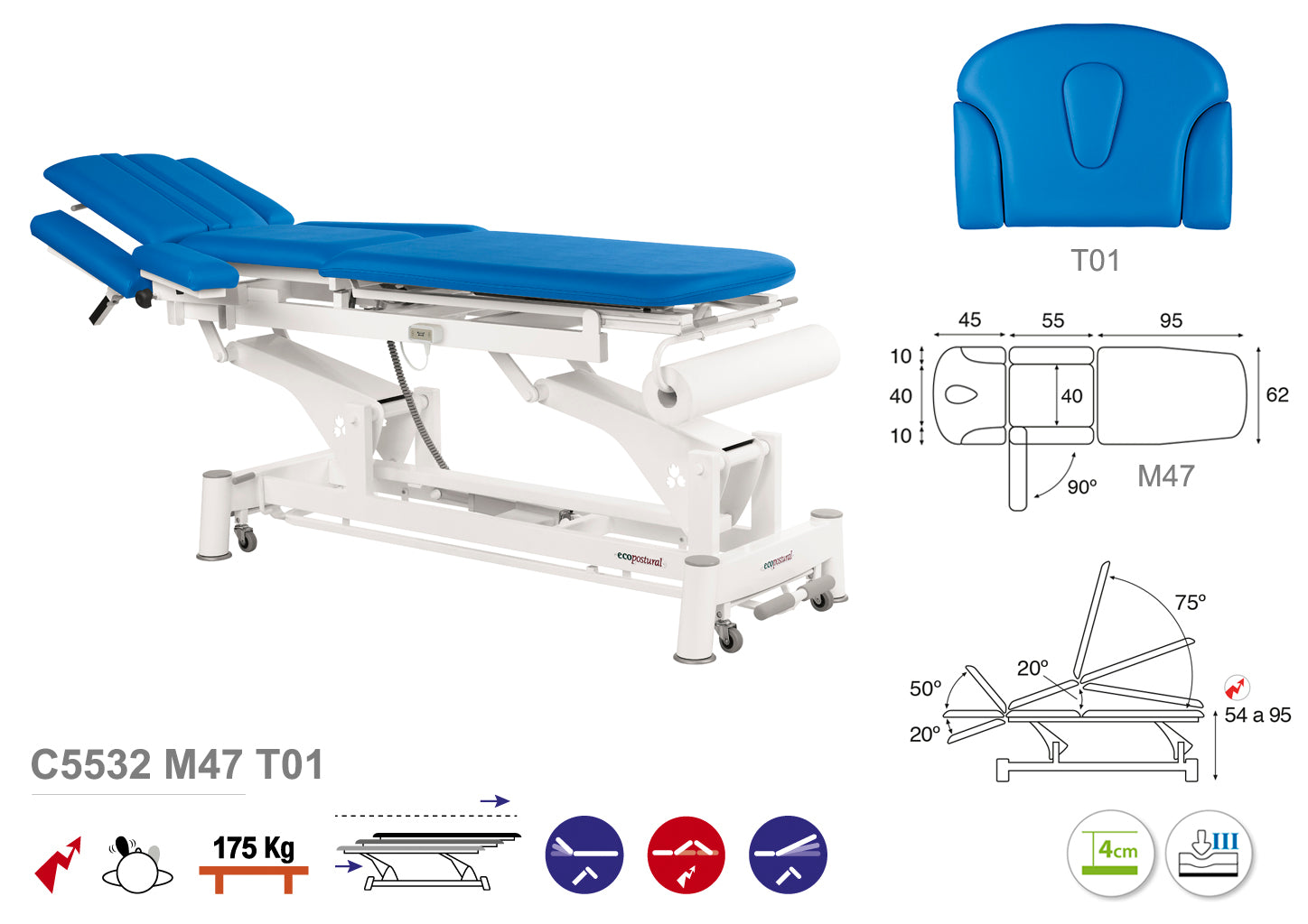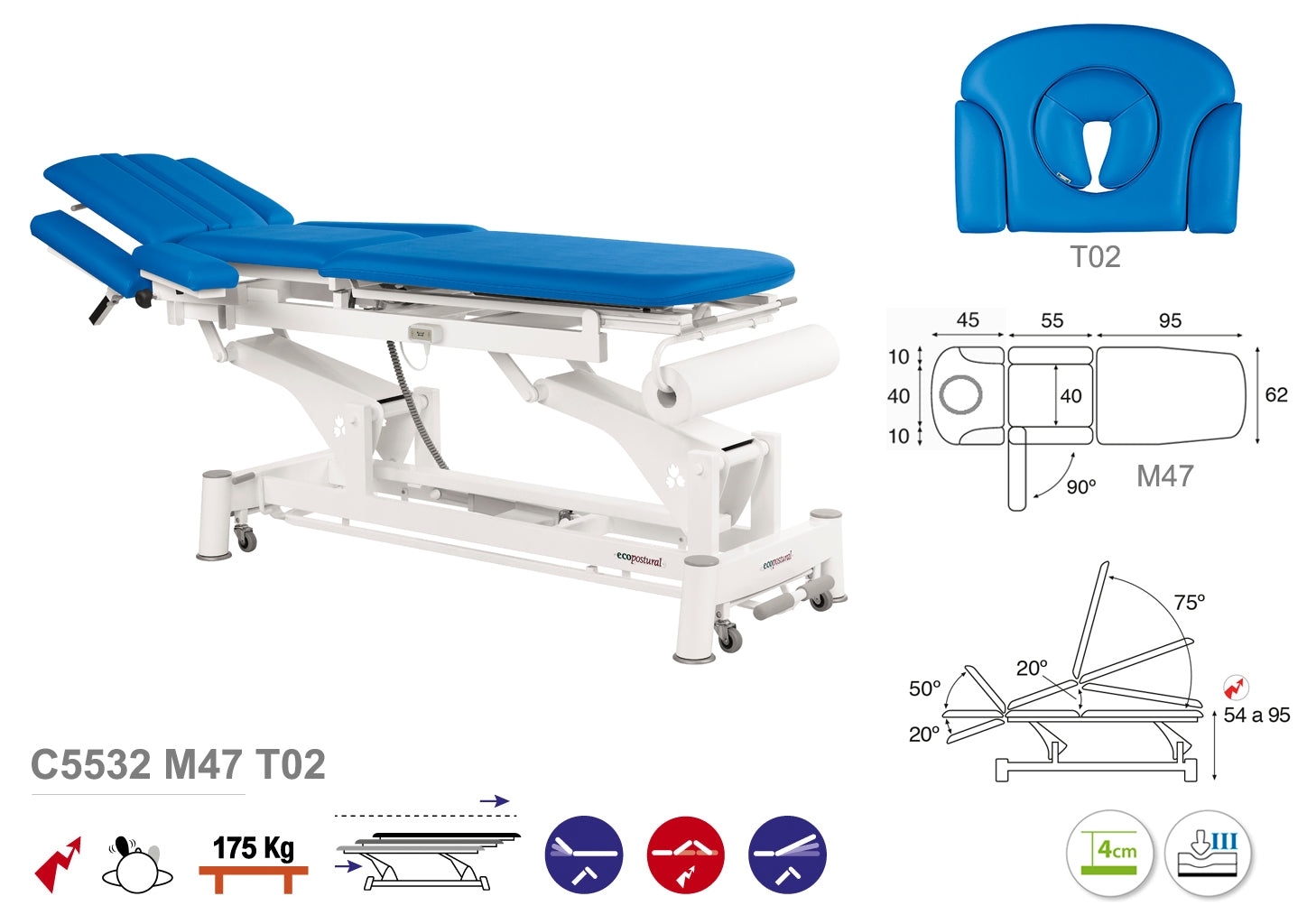 La Camilla Eléctrica Ecopostural Biela Blanca Técnica, modelo C5532, con unas medidas de 62x200 cm, está diseñada para ofrecer comodidad y adaptabilidad en entornos clínicos y de rehabilitación.