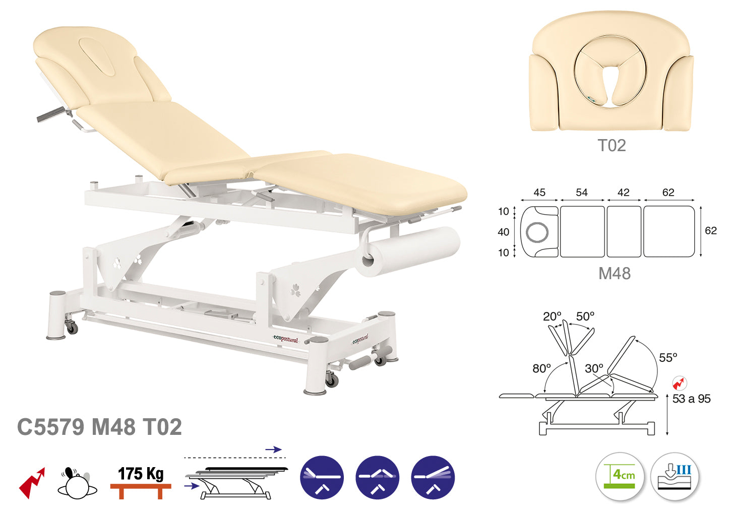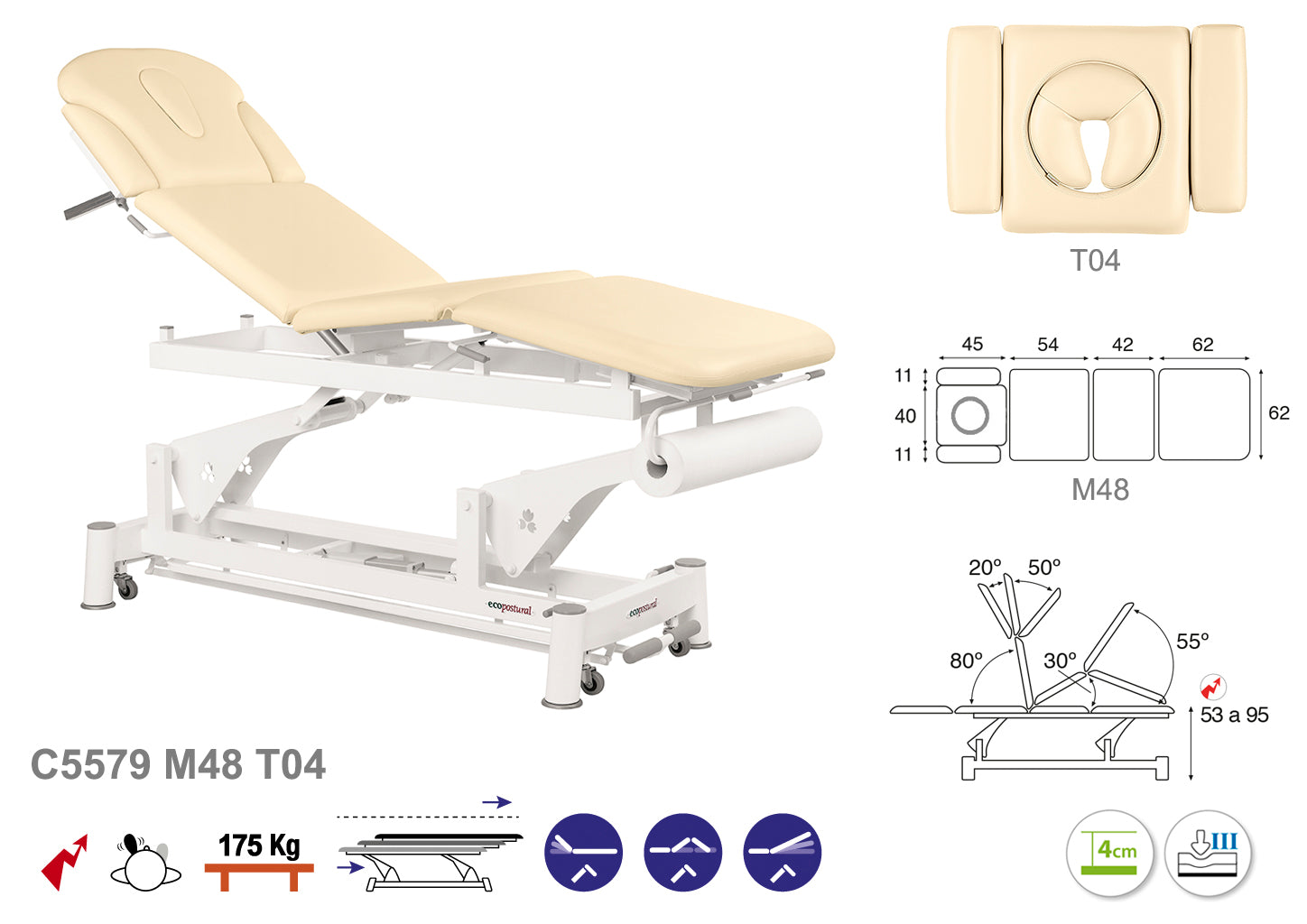 La Camilla Eléctrica Ecopostural Biela Blanca Técnica, modelo C5579, con unas medidas de 62x207 cm, está diseñada para ofrecer comodidad y adaptabilidad en tratamientos de fisioterapia y cuidado corporal.
