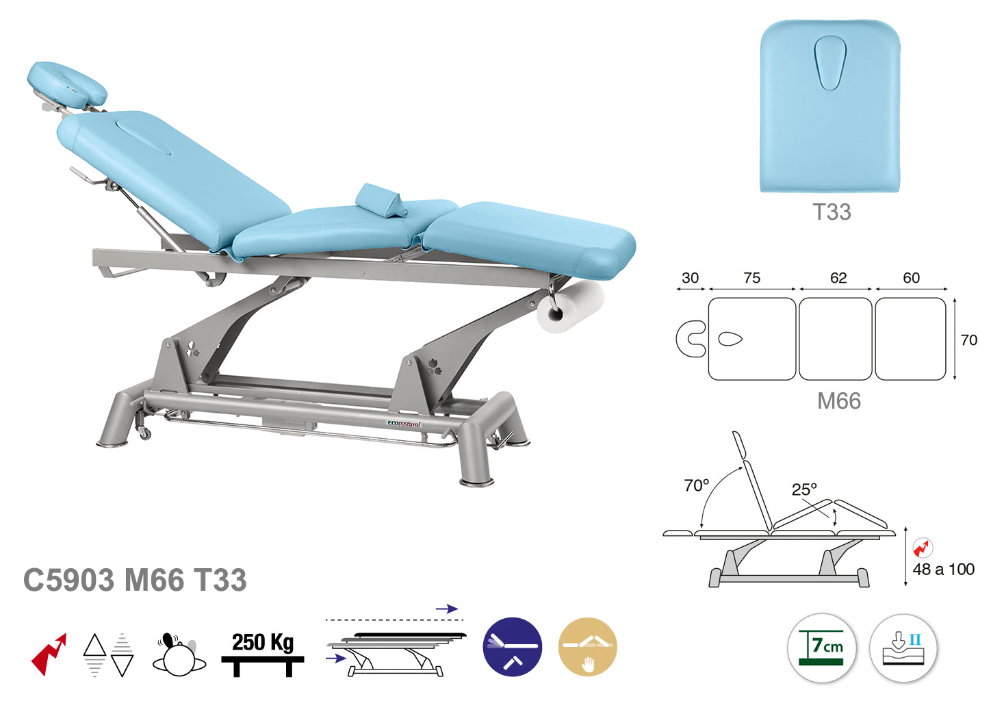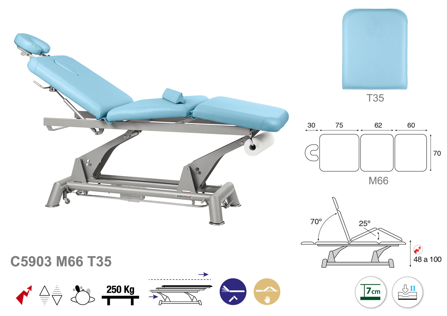 La Camilla Eléctrica (F) Biela Gris de 3 Cuerpos, modelo C5903, ofrece una solución versátil y cómoda para profesionales de la salud. Su diseño de tres cuerpos facilita el ajuste preciso para diversas posiciones terapéuticas, mientras que el sistema eléctrico permite modificaciones suaves y rápidas con solo pulsar un botón.