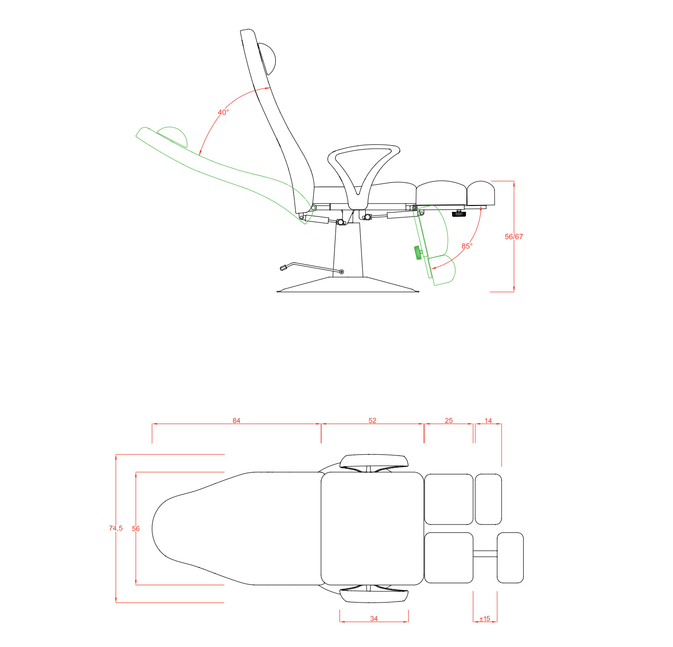 Respaldo y piernas independientes regulables con pistón de gas.