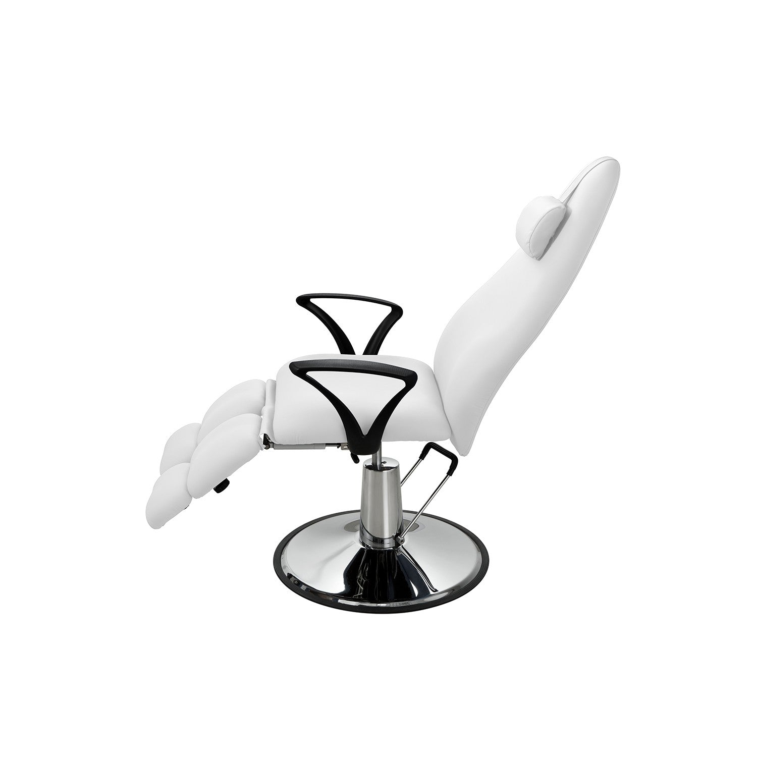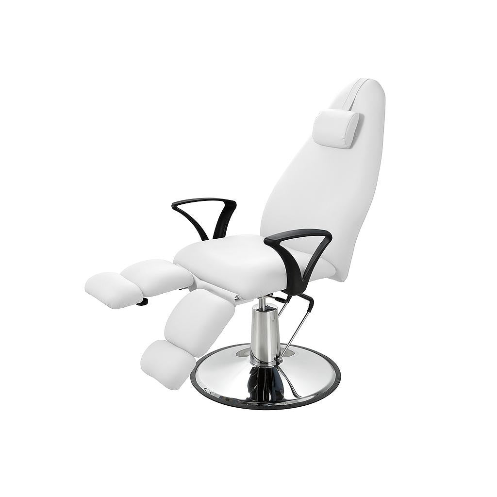 Sillón de podología rotatorio. Altura regulable mediante bomba hidráulica. Respaldo y reposapiés regulables independientemente mediante pistón de gas. Tapizado blanco en PU sin costuras de alta calidad y fácil de limpiar.