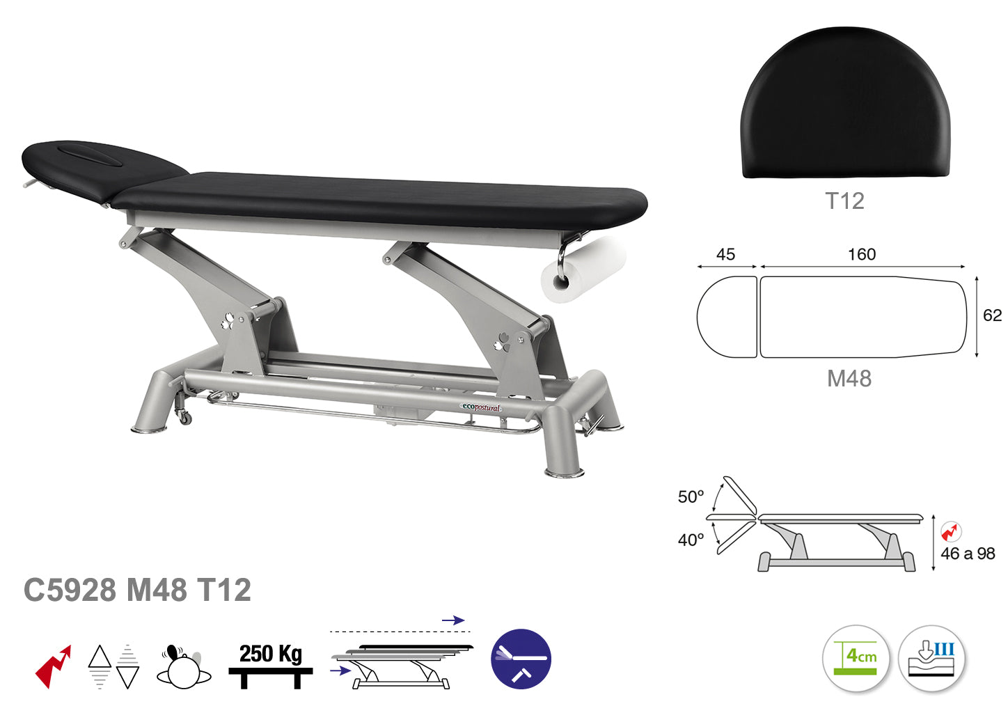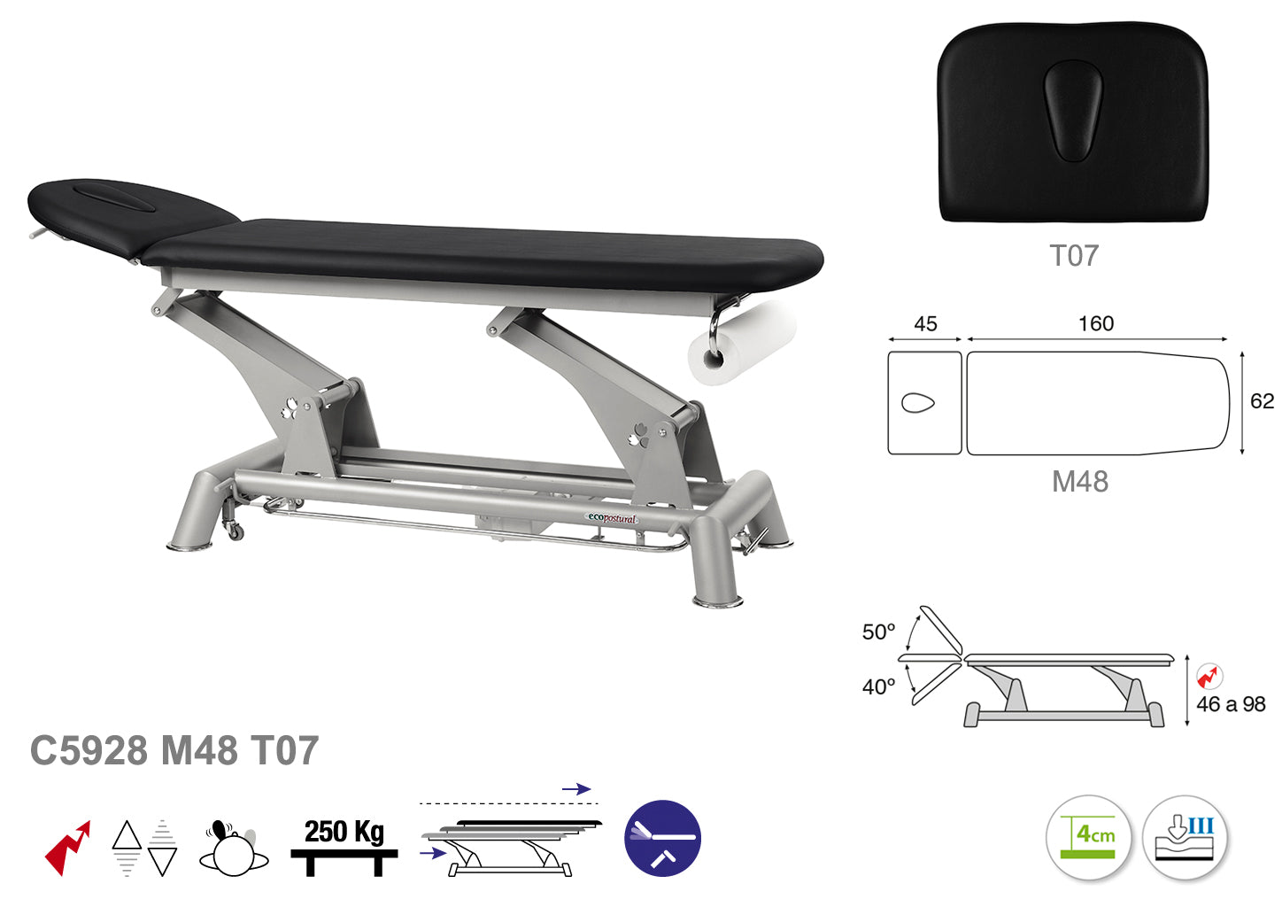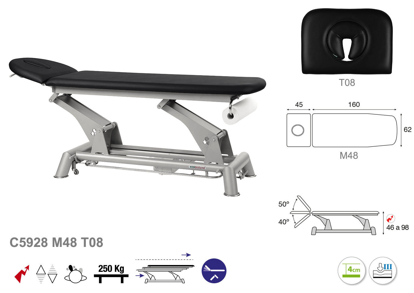 La Camilla Eléctrica Ecopostural (F) Biela Gris Técnica, modelo C5928, mide 62 x 207 cm y está diseñada para ofrecer una experiencia ergonómica y funcional en entornos profesionales. Su estructura eléctrica facilita ajustes precisos de posición, promoviendo comodidad tanto para el profesional como para el paciente durante las sesiones.