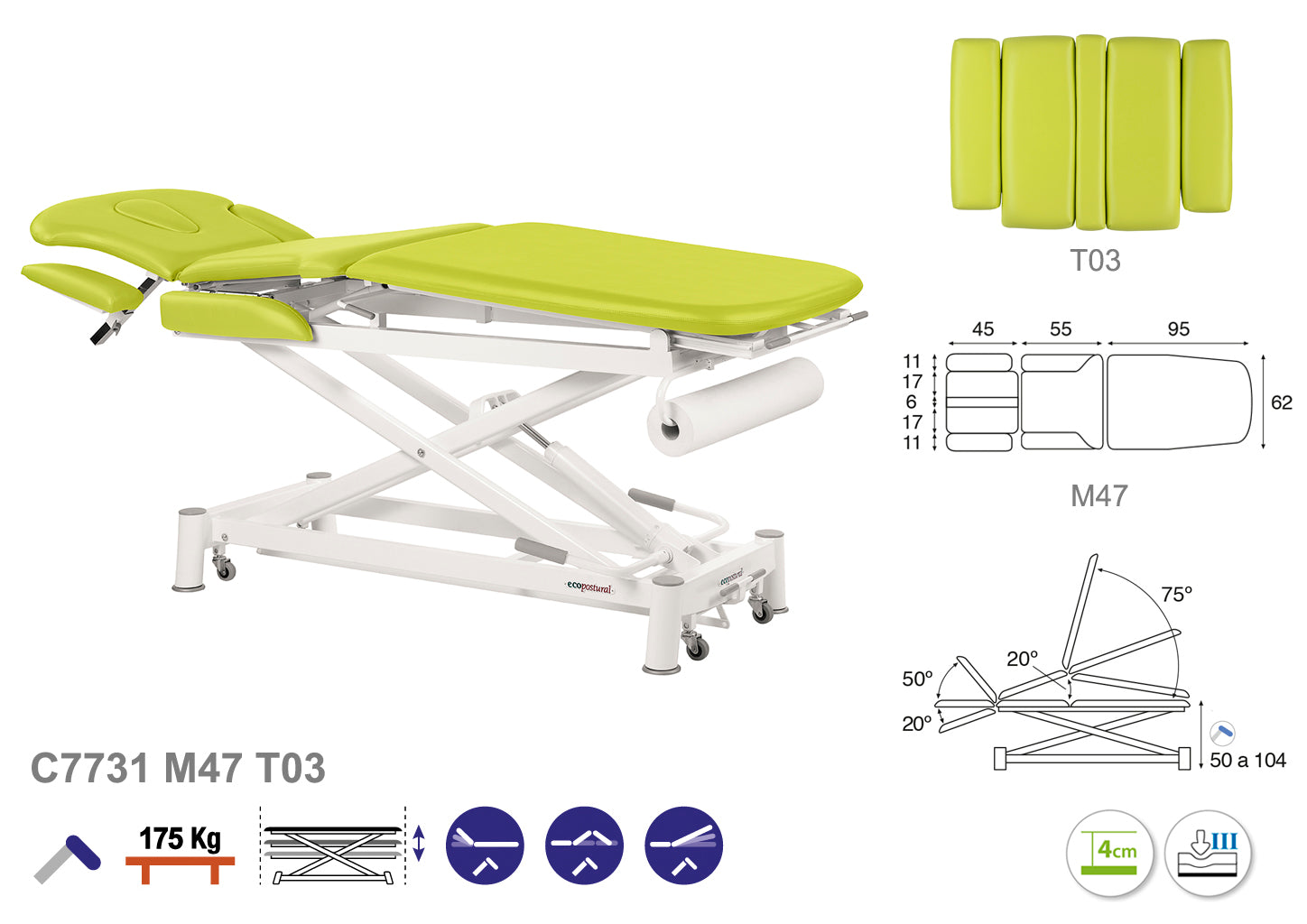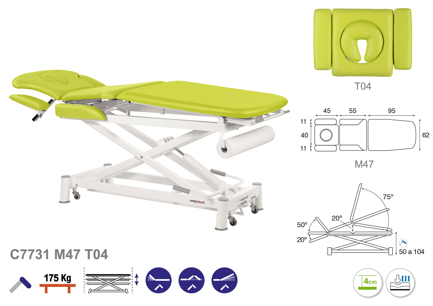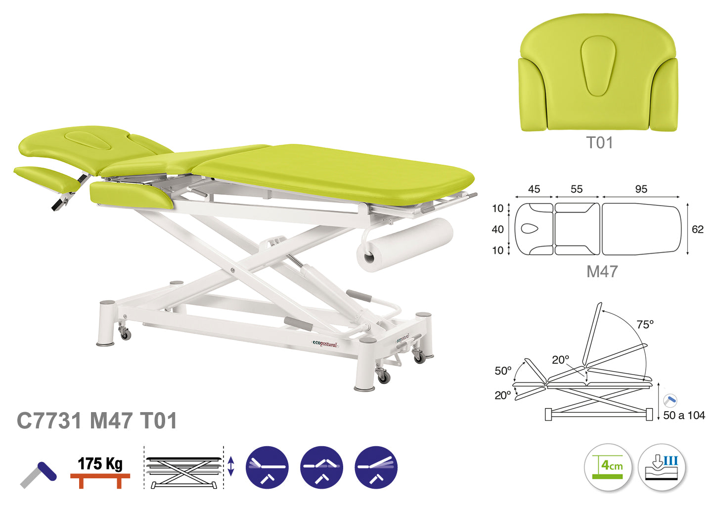La Camilla Hidráulica Ecopostural Tijera Blanca Multifuncional, modelo C7731, con unas medidas de 50x198 cm, está diseñada para ofrecer un soporte ergonómico y funcional en diversas terapias y tratamientos.
