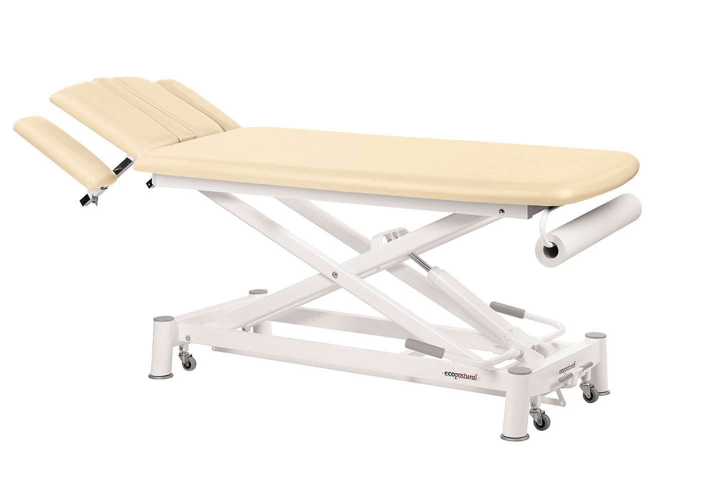 La Camilla Hidráulica Ecopostural Tijera Blanca Técnica, con medidas de 62x207 cm, está diseñada para ofrecer un soporte óptimo durante tratamientos de fisioterapia y actividades técnicas.