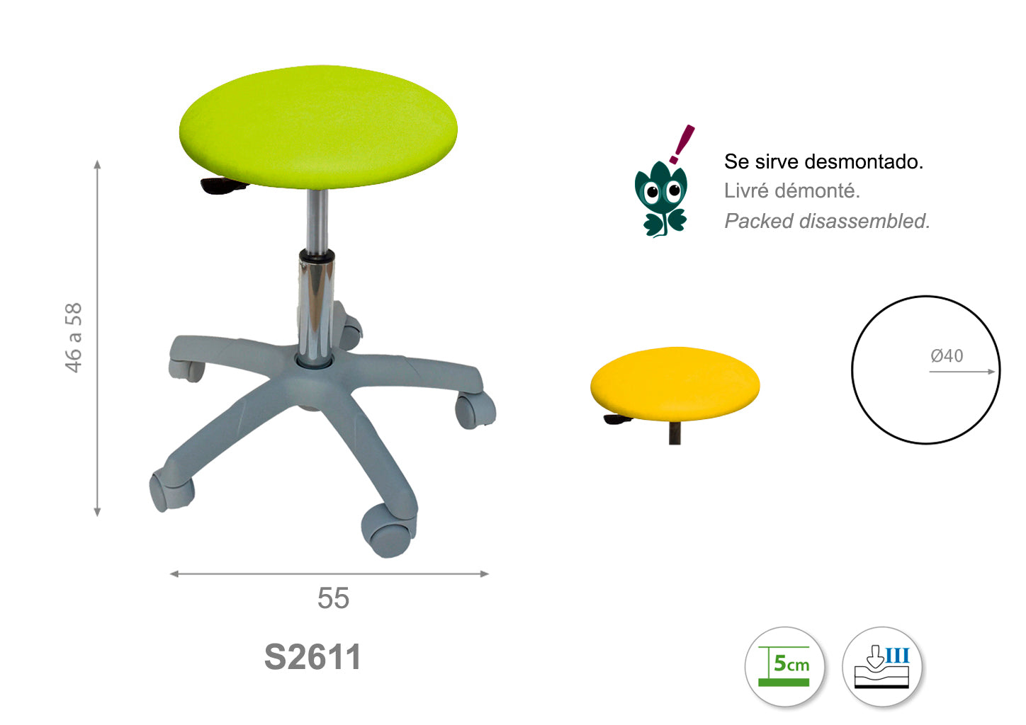 Perfecto para consultas, oficinas o áreas de trabajo, este taburete facilita la movilidad y el confort durante largas jornadas. Su diseño compacto permite un ahorro de espacio sin sacrificar la comodidad, convirtiéndolo en una solución práctica y elegante para diversas necesidades.