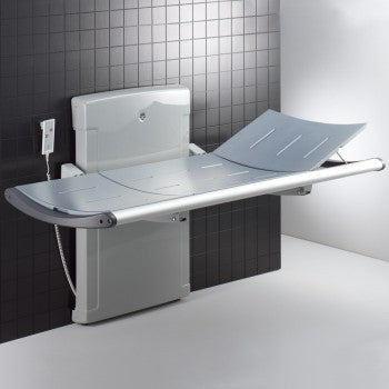 Cuando la camilla está montada a la altura adecuada, se puede graduar su altura simplemente accionando el control remoto (que tiene un cable de 1,5 m de largo para que cuidador y paciente no pierdan el contacto visual mientras la camilla sube o baja).