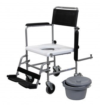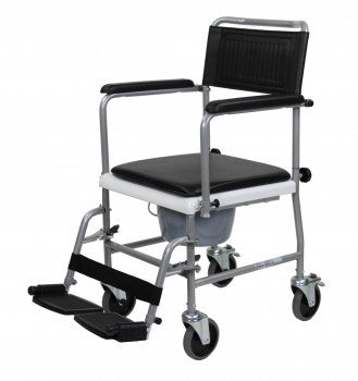 Silla inodoro con ruedas. Fabricada en acero pintado, muy duradera y resistente al uso intensivo. Ampliamente utilizada en instituciones y residencias. Silla versátil que se puede colocar directamente sobre el inodoro del WC o utilizar la cubeta / orinal con tapa que lleva incorporada para utilizarla en otro lugar. Los reposabrazos son abatibles para facilitar la trasferencia lateral, por ejemplo desde la cama. Reposapiés desmontables y graduables en altura. Lleva 4 ruedas de 125 mm, dos de ellas con freno.