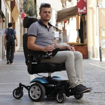 La R300 es una silla de ruedas eléctrica de tracción central, gira prácticamente sobre su propio eje ofreciendo un radio de giro muy reducido. Esto unido a las dimensiones compactas de solo 61 cm de ancho, facilita el movimiento en espacios pequeños tanto en interior como en el exterior. Máximo confort. La suspensión independiente en las seis ruedas amortigua los impactos para una conducción confortable y suave en cualquier situación.