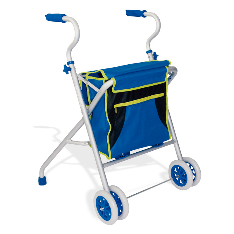 Caminador plegable, con cuatro ruedas delanteras, regulable en altura, muy ligero y fácil de plegar. Lleva incorporada una práctica bolsa portaobjetos de gran capacidad.