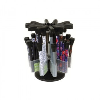 Multicolor y alegre expositor giratorio del que cuelgan 10 bastones AD 413 (uno de cada color disponible) ocupando un espacio mínimo. Su base circular apenas tiene 23 cm de diámetro y una altura de 50 cm.