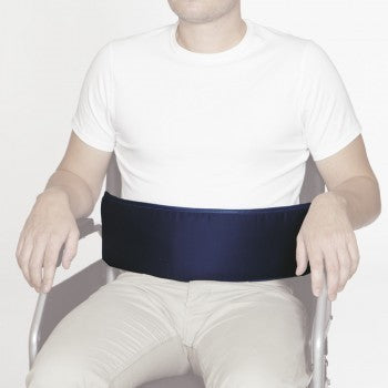 Cinturones de colocación sencilla y rápida. Una banda acolchada sujeta al paciente por la cintura y se abrocha por detrás de la silla con una hebilla de plástico de accionamiento rápido y con velcro. Permiten libertad de movimientos en las extremidades y en el tórax. Indicado para personas con tendencia a deslizarse hacia delante en la silla y evitar caídas.