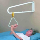 Trapecio de acero para alicatarlo a la pared. Es especialmente útil para utilizarlo sobre el WC o en la cama. El asidero triangular se ajusta a la medida más conveniente. Se pliega contra la pared cuando está fuera de uso.