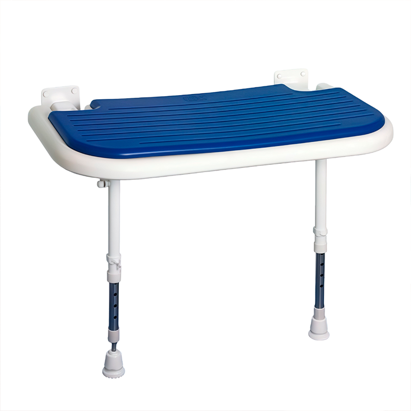 Asiento de ducha abatible en acero inoxidable con cojín acolchado. Su diseño está especialmente pensado para tallas grandes. Para mayor comodidad, su asiento es de altura regulable: desde 39 a 64 cm.