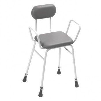 Robusta silla fabricada en acero con asiento y respaldo con tapizados totalmente sellados. El asiento está ligeramente inclinado para que sea más fácil levantarse. Anchura entre brazos: 45 cm.