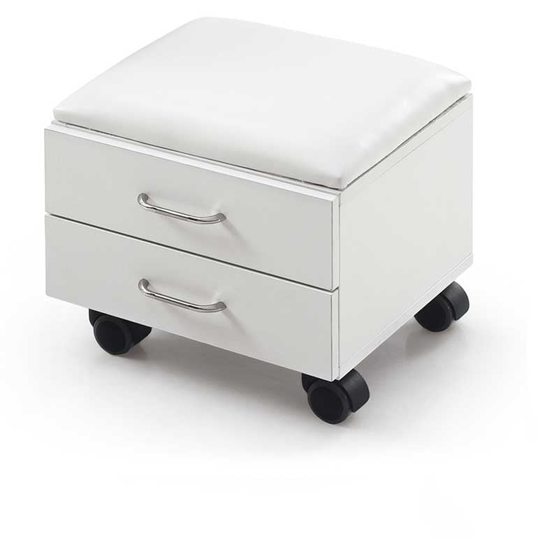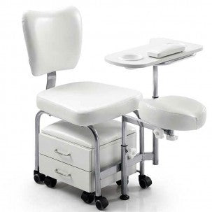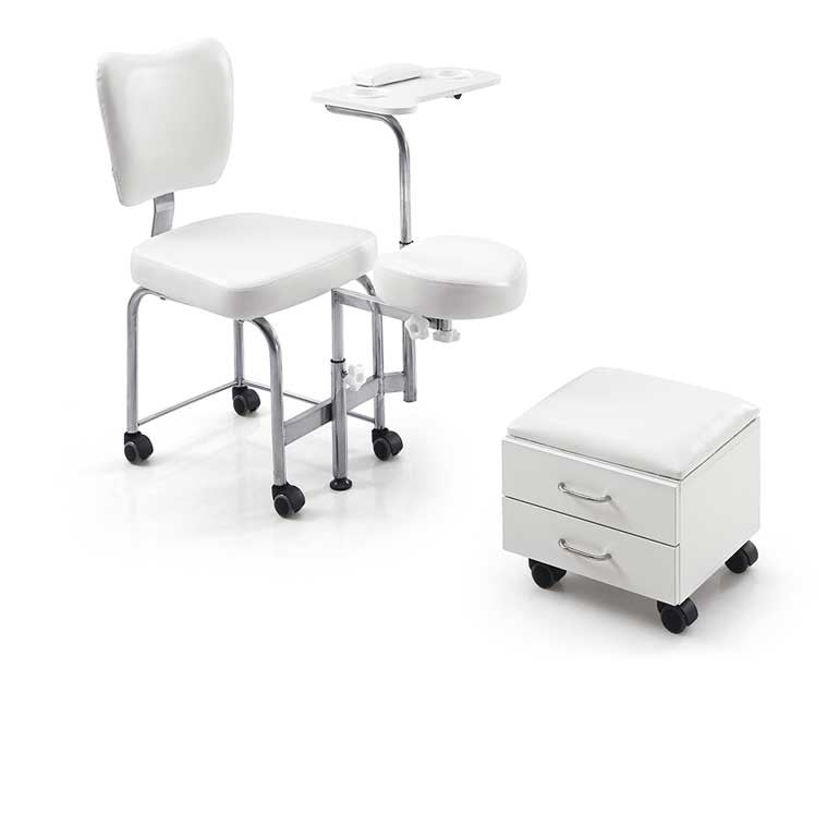 Silla de pedicura que incorpora taburete con cajonera de 2 cajones de almacenamiento, ambos con ruedas.
