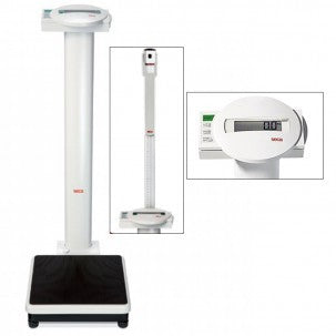 Báscula Seca 799 equipada con tallímetro, el cual, permite realizar pesaje y medición en una sola operación.