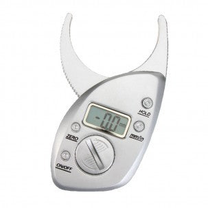 3- Manténgase en pie, con firmeza, agarre el pliegue cutáneo con el pulgar y el índice izquierdo. coloque el medidor a través de el pliegue, sin dejar de sostener el pliegue con la mano izquierda.