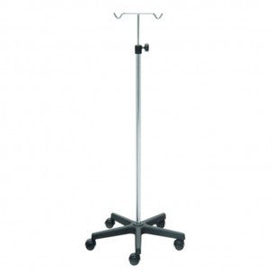 Soporte de suero, portasueros o palo de suero con base rodable. Su base de 50 cm de diametros le otorga gran estabilidad y los ganchos de acero permiten soportar elementos pesados.