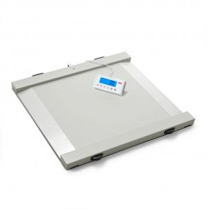 Báscula para silla de ruedas electrónica con rampas integradas en ambos lados. Las asas y dos ruedas permiten un fácil manejo y transporte de la escala. Fabricada en acero, proporciona una estabilidad extra y lleva un peso de hasta 300 kg.