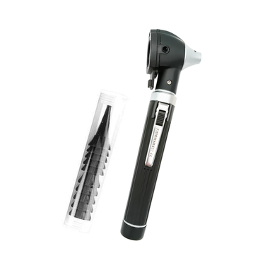 Otoscopio de reducido tamaño que cabe en el bolsillo. Incluye 10 espéculos para un correcta examinación del tímpano y el aparato auditivo. Marca Fisiomarket