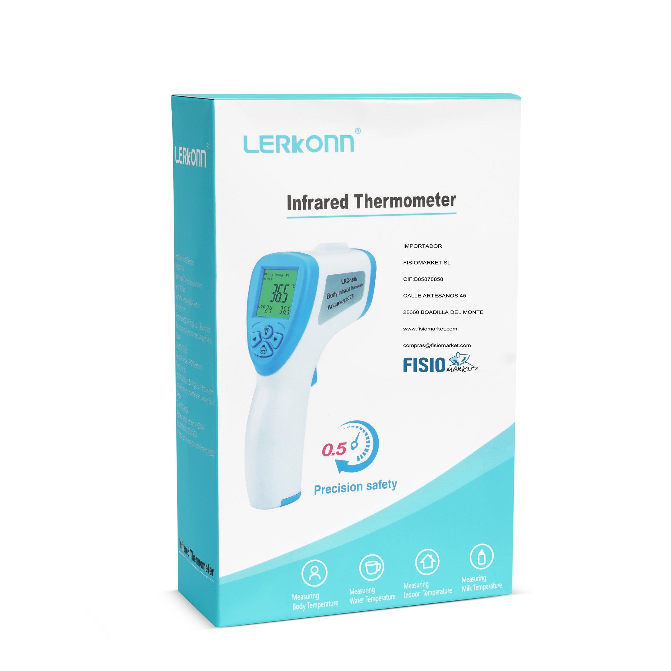 Termómetro digital sin contacto Fisiomarket, diseñado para mediciones rápidas y precisas de temperatura corporal sin necesidad de contacto físico. Ideal para entornos clínicos, hospitalarios y domésticos donde la higiene y la velocidad son prioritarias.