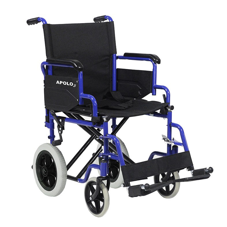 La nueva silla de ruedas APOLO 3 está fabricada en acero. Dispone de una variedad de tallas de 42 a 48 cm de ancho de asiento y dos formatos de ruedas trasera, una de 600 mm autopropulsable y la versión de 300 mm no autopropulsable ideal para pasos estrechos.
