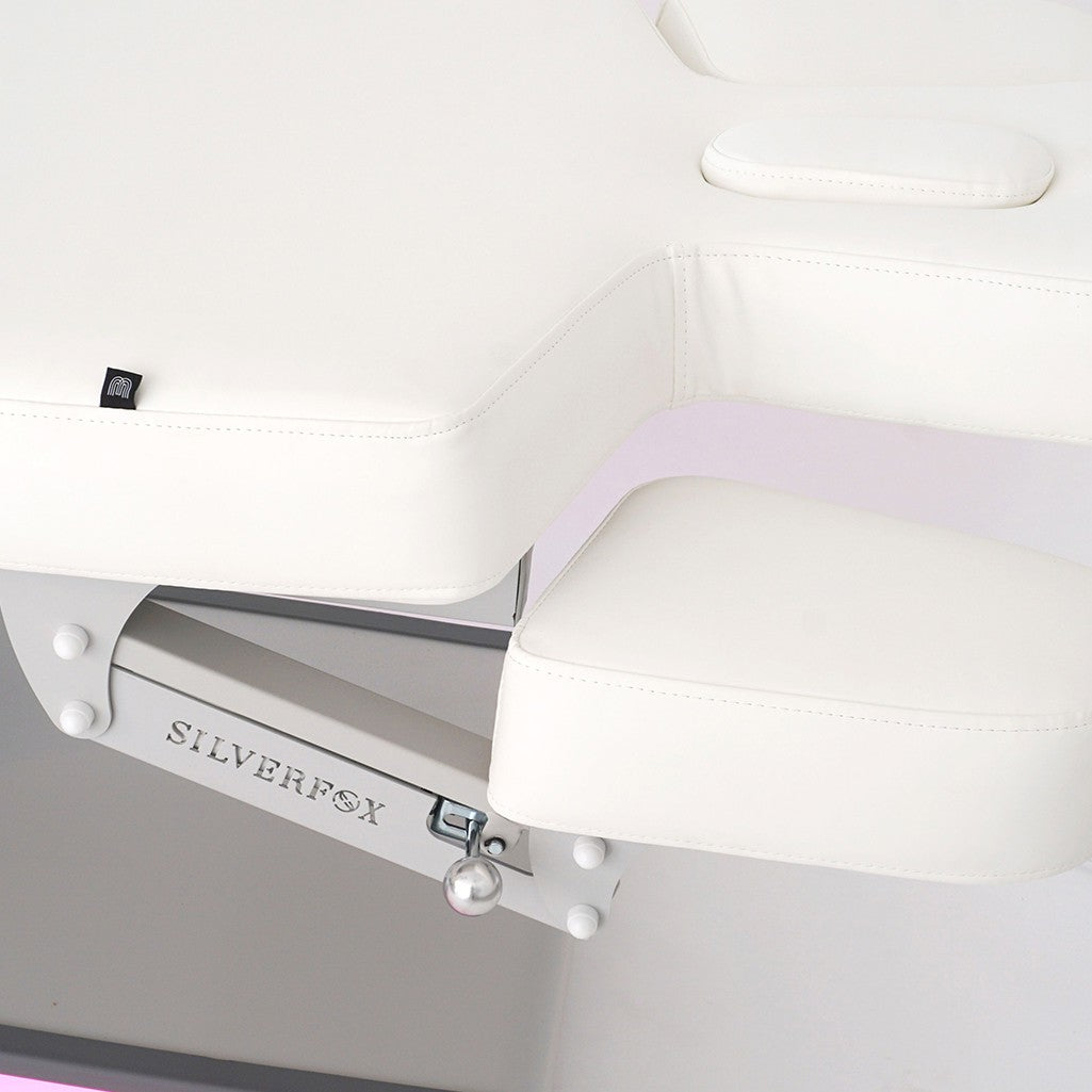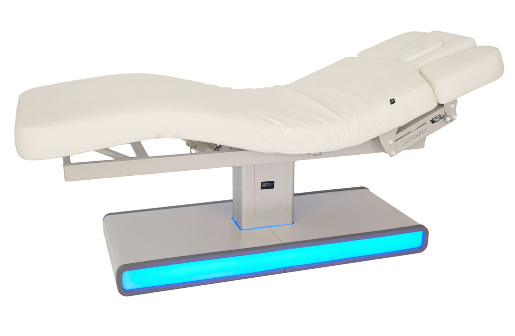 Colchón de una única pieza con 3 secciones. Reposabrazos ajustables y cabezal con agujero facial. La base incluye un sistema de iluminación LED de colores intercambiables que puede adaptarse a cada centro.