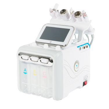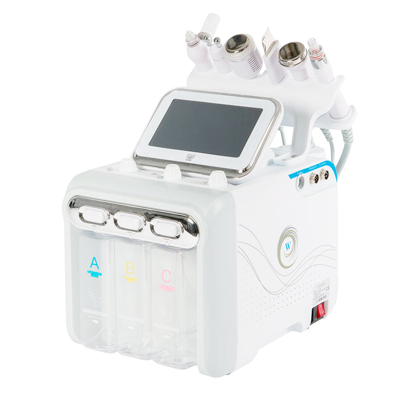 - Para limpiar el manípulo de hidrodermoabrasión, empiece seleccionando la botella C y ajuste al máximo la intensidad de succión. Haga clic en “start” y mantenga el dedo colocado sobre el cabezal durante 5-10 segundos. Extraiga el cabezal y repita el movimiento 8-10 veces. Cuando la botella C ya esté limpia y vacía, llene las botellas A y B de agua templada y repita la acción misma acción con estas dos botellas, así evitará que los tubos y manípulos se obstruyan. Una vez terminado, extraiga el cabezal y límpielo junto a los otros con un trapo para eliminar restos de suciedad. También puede ponerlos en remojo con alcohol o un producto desinfectante durante un minuto.