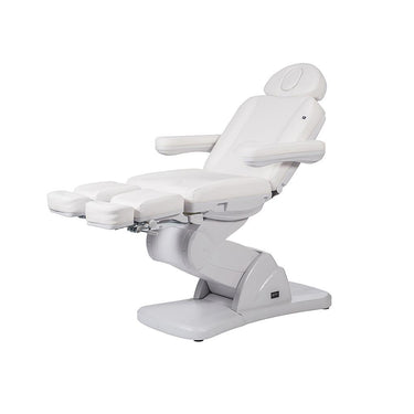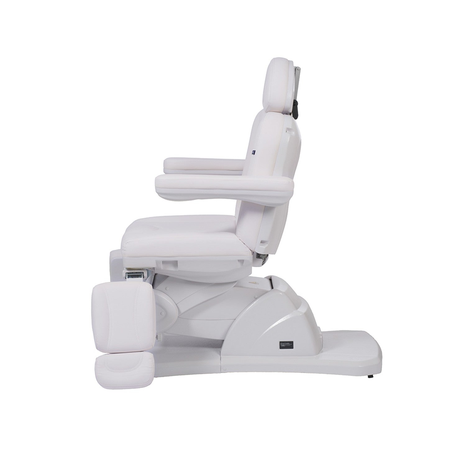 Silla de podología de alta gama de alta comodidad equipada con 3 motores que controlan la altura, el respaldo y la inclinación del asiento. Los legrests giran hasta 90 ° y son regulables en altura mediante un elevador de gas. Apoyabrazos reclinables y reposacabezas regulable con orificio de ventilación. Los paneles de botones integrados en el respaldo y el asiento permiten un control completo de todas las funciones desde cualquier punto de la silla. Tapizado de PU blanco de fácil limpieza.