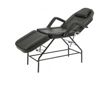 Camilla fija de 3 cuerpos y estructura metálica blanca MYLO. La inclinación del respaldo y del reposapiés se regulan manualmente. Reposabrazos y cojín reposacabezas extraíbles con agujero facial. Tapizado blanco en PVC fácil de limpiar.