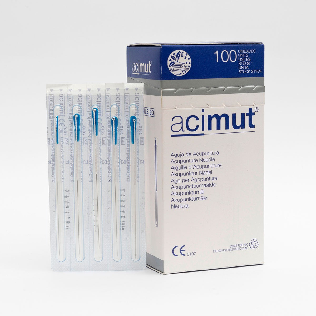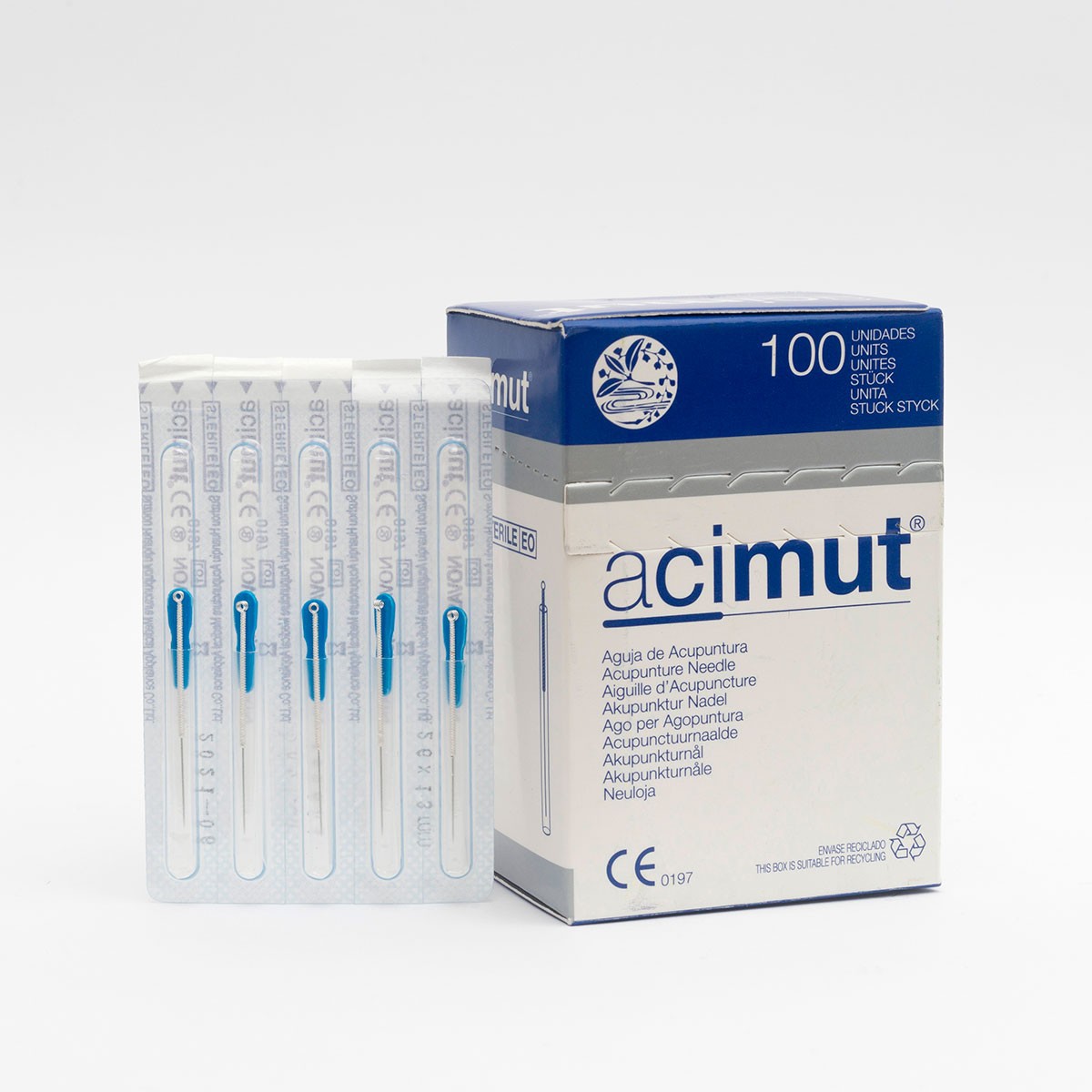Aguja de acupuntura desechables de la marca "Acimut". Su recubrimiento de silicona permite una inserción indolora. Blíster con reverso de papel. El envase individual termosellado permite una rápida y cómoda extracción. Medida válida para punción seca
