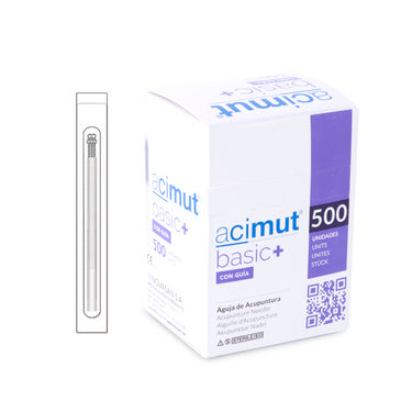 Aguja de acupuntura desechable con mango bañado en plata con guía. Fabricada en acero japonés con recubrimiento en silicona para una inserción indolora. Blíster con reverso de papel.