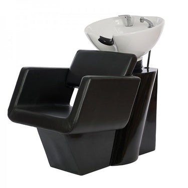 Lavacabezas individual de diseño elegante con asiento de lineas cuadradas Milton, que dispone de reposabrazos para una mayor sensación de confort, e incorpora una pica de cerámica basculante en color blanco que se adapta a la nuca dando una sensación de relax.