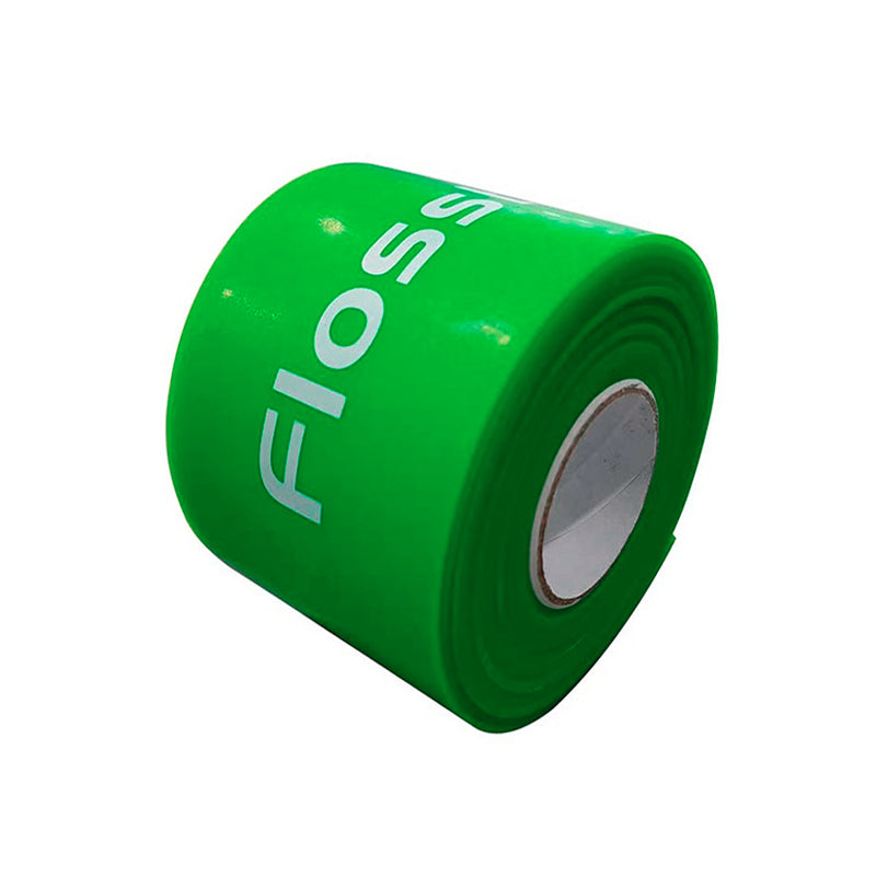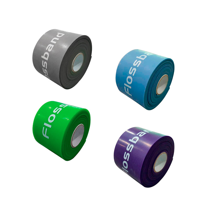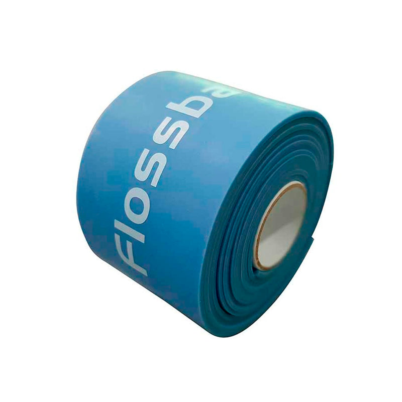 Flossband by Sanctband es una banda de caucho natural que mide 2 metros de largo y 5 cm de ancho y tiene que ser aproximadamente 4-7 veces más grueso en comparación con una banda media de gimnasio. Es fuerte y se envuelve firmemente alrededor de la parte del cuerpo a tratar o en la articulación.