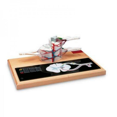 Este modelo presenta un segmento de la columna vertebral superior torácica, dividida lateral y longitudinalmente, con las raíces de los nervios vertebrales. Sobre base.