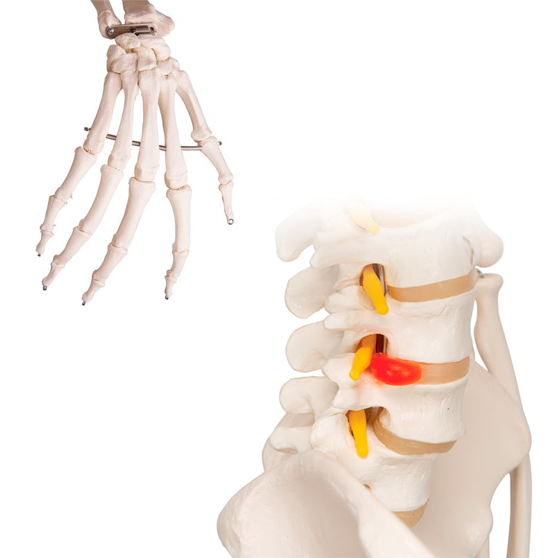 Una vez que se haya doblado, Fred permanece en la postura alcanzada, con el fin de evidenciar posturas tanto correctas como incorrectas como también malas posturas patológicas. Todos los movimientos del cráneo se pueden demostrar con las articulaciones de la cabeza. En este esqueleto están representados los nervios espinales tanto como las arterias vertebrales, como también una hernia discal entre la 3ª y la 4ª vértebra lumbar ¡Reeditado sobre un soporte aún más estable con 5 ruedas!
