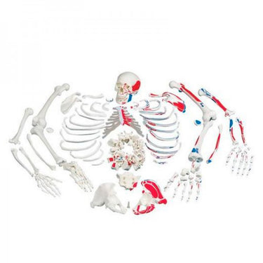 Esta versión especial está pintada a mano y enumerada con el fin de mostrar los orígenes de los músculos en rojo y las inserciones musculares en azul en el lado izquierdo. Todos los huesos y las estructuras óseas, tales como fisuras, foramina y procesos están enumerados manualmente en el lado derecho. El cráneo es de 3 piezas. Una mano y un pie están articulados en un alambre. Sus contrapiezas están ensartandas en forma suelta en nylon Viene con una tarjeta de diferentes idiomas para identificar más de 600 estructuras anatómicas enumeradas. Viene con una caja de almacenamiento seccionada.