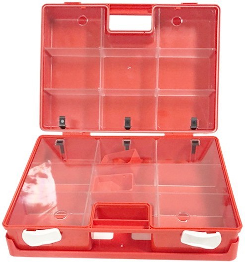 Botiquín rígido con varios compartimentos. No incluye material de primeros auxilios. Ideal para colgar en la pared.