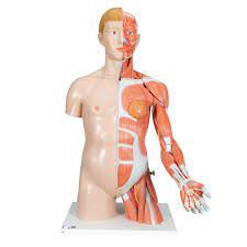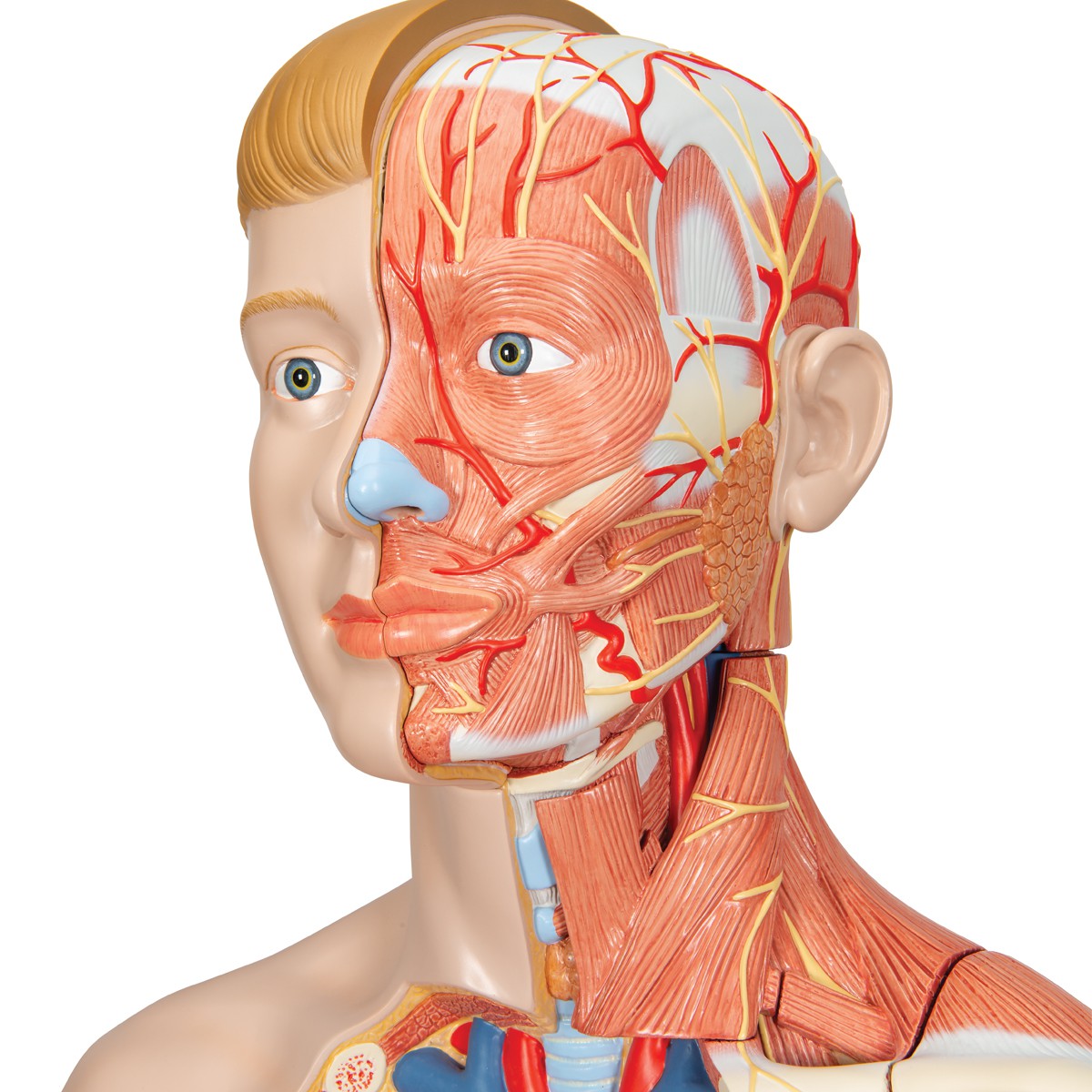 Unico en todo el mundo, este torso de tamaño natural lleva un brazo con músculos desmontable en 6 partes. Este valioso modelo reproduce la anatomía completa de la parte superior del cuerpo humano. Gracias a la perfección de los detalles, está indicado para la formación de los estudiantes de medicina. La mitad derecha muestra la piel, la mitad izquierda muestra la musculatura externa e interna, con nervios, vasos y estructuras óseas. Otra de las características de este estético modelo es la reproducción fiel de los órganos internos. Es desmontable en: