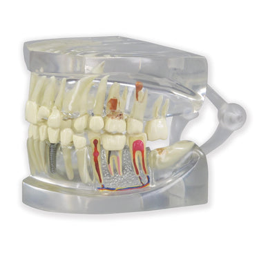 Mandíbula a tamaño real moldeada, articulada y transparente para mostrar las raíces. La parte sana muestra una dentición y oclusión normales. La parte afectada presenta múltiples patologías, entre las cuales: supererupción, absceso alveolar apical con caries, enfermedad periodontal, absceso lateral, abfracción, curvatura irregular de la raíz, caninos incluidos, erosión, fractura dental, inclusión horizontal, pulpitis radicular, conducto radicular con corona, reabsorción interna, atrición, reabsorción radicular externa, implantes y fractura radicular.
