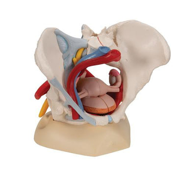 Este modelo original de una pelvis femenina representa información detallada acerca de la topografía de los huesos, ligamentos, vasos, nervios, músculos del piso pélvico y órganos pélvicos femeninos. La totalidad del piso pélvico está representado con una sección del esfínter anal externo con sección media sagital parcialmente extraíble, esfínter uretral externo y los músculos transversos profundo y superficial del periné, y bulboesponjoso. El recto, el útero con las trompas de Falopio, los ovarios y la vagina también son desprendibles y pueden desmontarse en dos mitades por su sección media sagital. La mitad pélvica derecha muestra las divisiones y la anatomía topográfica de la arteria ilíaca común, las arterias externa e interna y también de la vena ilíaca común y la vena ilíaca externa. También muestra el plexo sacro derecho, el nervio ciático derecho y el nervio pudendo. Huesos y ligamentos mostrados: dos huesos ilíacos, la sínfisis púbica, el sacro y el coxis, la quinta vértebra lumbar con el disco intervertebral. Una sección media sagital a través de la quinta vértebra lumbar, sacro y coxis, permite desmontar las dos mitades de la pelvis, mostrando una parte de la cauda equina en el canal vertebral. La mitad izquierda de la quinta vértebra lumbar es extraíble. La mitad derecha del modelo muestra los siguientes ligamentos pélvicos: ligamento inguinal, ligamento sacrotuberoso, ligamento sacroespinoso, ligamentos sacroilíacos anteriores, ligamento iliolumbar, ligamento longitudinal anterior, ligamento sacroilíaco interóseo, ligamento sacroilíaco posterior y membrana obturadora.