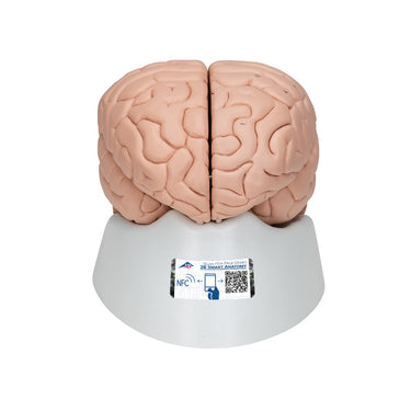 Un modelo del encéfalo humano muy detallado divido medianamente. Sobre soporte desmontable. Ambas mitades se pueden desmontar en: