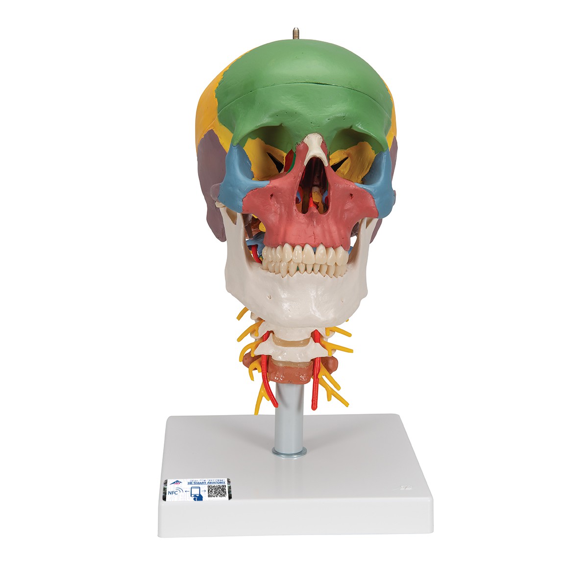 Este modelo muestra las formas y relaciones de las distintas láminas óseas del cráneo con la ayuda de 19 colores didácticos. Montado flexible sobre la columna cervical (C1, C2 y C7 están coloreadas), este modelo también muestra rombencéfalo, médula espinal, nervios espinales de la columna cervical, arterias vertebrales, arteria basilar y arterias cerebrales posteriores. Dispone de un soporte.