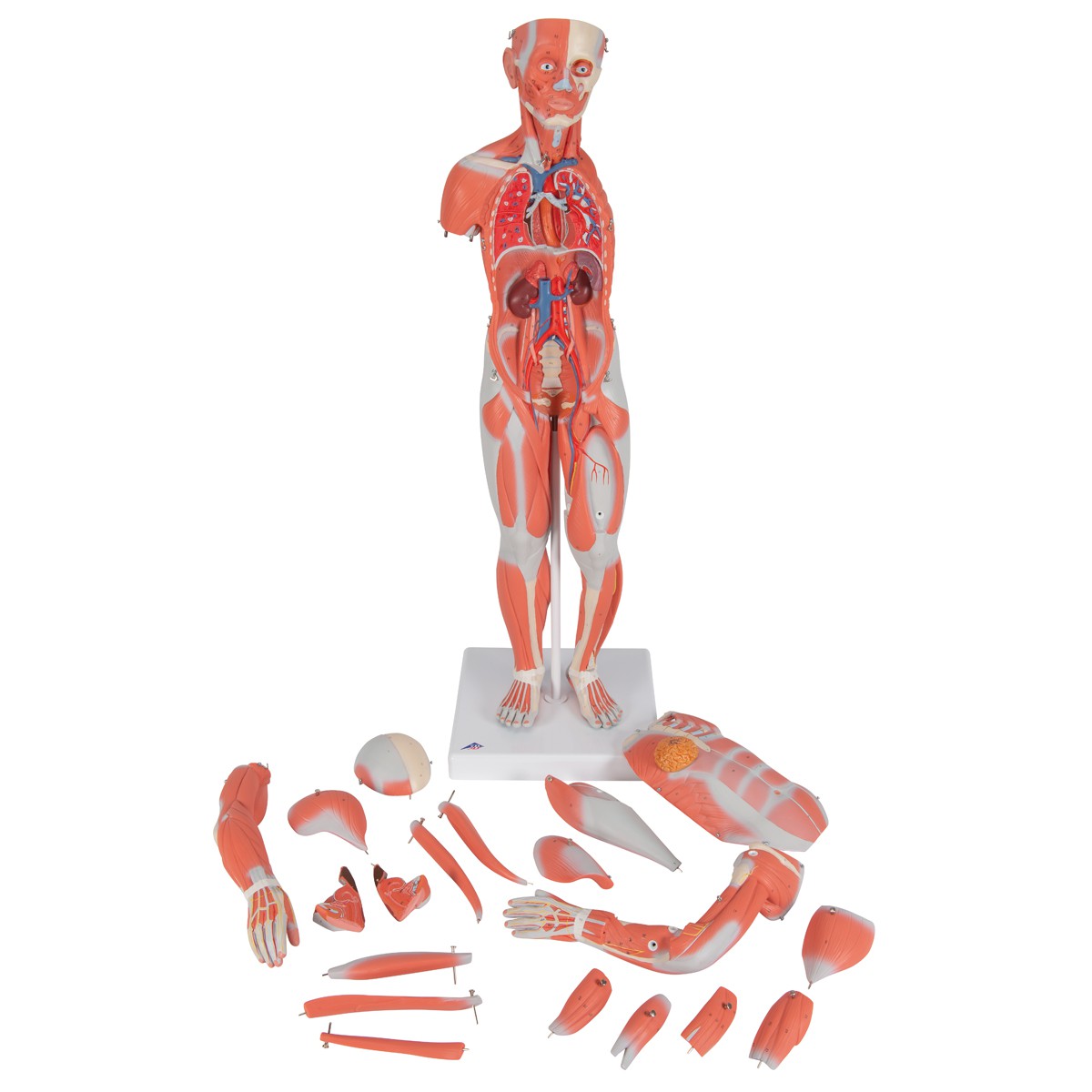 La anatomía humana completa en un tamaño conveniente. Esta versión de 84 cm de altura de nuestra figura de lujo con músculos es una perfecta selección para realizar demostraciones completas de la musculatura humana. Detallado a mano exquisitamente y completo con 21 piezas desmontables y/o cortables, esta versión representa alta calidad a un precio económico. Pintado a mano en colores realistas, este modelo viene completo con un soporte y un texto explicativo en diferentes idiomas. Este modelo incluye: